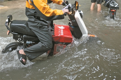 昨日,在广州市海珠区,外卖小哥冒着强降雨天气送餐。