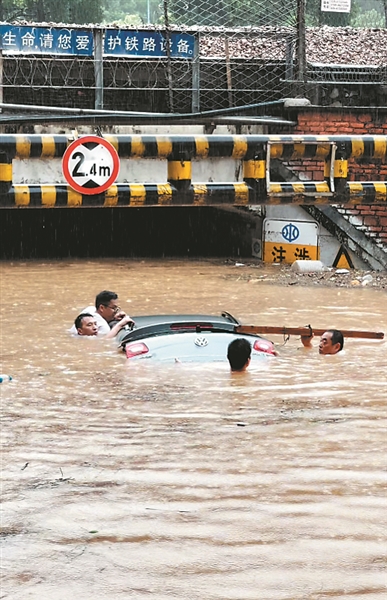 中年男子游向逐渐沉没的小车,使劲拽车门,纹丝不动。这时,两名年轻人,以及民警赵庆辉、温东林赶到,同样是毫不犹豫地走向齐胸深的水里救人。