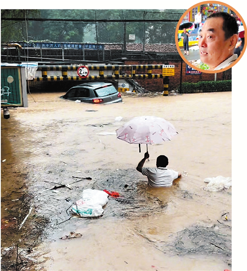 (大图)东莞塘厦大岭古涵洞前,司机被困熄火的车中。图中的大叔第一个下水救人。(圆图)救人后,他不住用手擦着眼睛,说“没事”,从拍摄者手中接过自己的塑料袋就走了。
