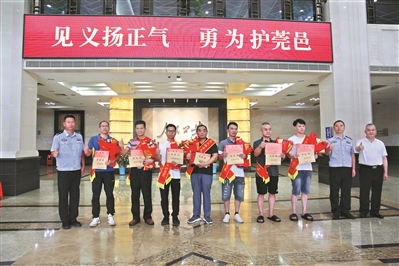 广州日报讯 (全媒体记者钟宏连、谢英君摄影报道)8月7日下午,东莞市见义勇为评定委员会、东莞市见义勇为基金会为李春久、冯国林、刘立传、邓碧兴、潘勇斌、曾二军、邹林达等7名果敢下水施救人员颁发见义勇为确认证书、奖金,通过选树典型、激励先进,号召社会公众营造“人人崇尚见义勇为、人人支持见义勇为、人人敢于见义勇为”的良好风尚。