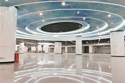 广州地铁十三号线二期天河公园站站厅,装饰沿用“浩瀚天际,天河星雨”的主题概念,营造出浩瀚星空的璀璨意境。