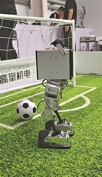 来自广州的高擎机电在活动现场设置了小型足球场地。身高仅52厘米、体重7公斤的机器人“小派”,小巧灵活的身影在绿茵场上来回穿梭,传球、运球一气呵成,吸引大批观众围观打卡,成为大会焦点之一。