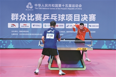 今年5月,十五运会群众比赛乒乓球项目预赛(南方、北方赛区)分别在湖南长沙和辽宁鞍山举行,来自全国近千名民间高手参赛,获得团体前八名以及单打四个年龄组别前八名的队伍和选手获得决赛阶段参赛资格。8月8日至14日,决赛阶段在广州举行,除了男子团体和女子团体金牌,还将产生男子单打、女子单打金牌(25岁—39岁组、40岁—49岁组、50岁—59岁组、60岁—69岁组)。8月8日、9日为团体项目小组赛阶段,参赛队伍分成四个小组展开单循环角逐,每组前两名晋级八强。1/4决赛和半决赛将在10日举行,女团和男团冠军分别在11日下午和晚上决出。从8月12日开始,两个单打项目各个年龄段的角逐全面铺开,14日将决出8枚单打金牌。