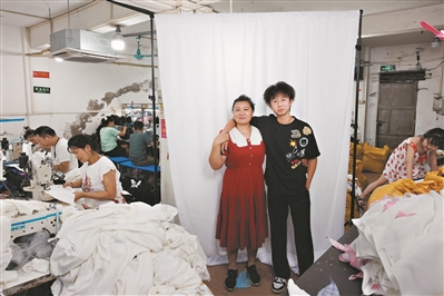 7月30日,广州市海珠区鹭江村的制衣车间内,16岁的余智豪与妈妈一起站在幕布前拍摄合影。从他记事起,妈妈就在广州创业打拼。