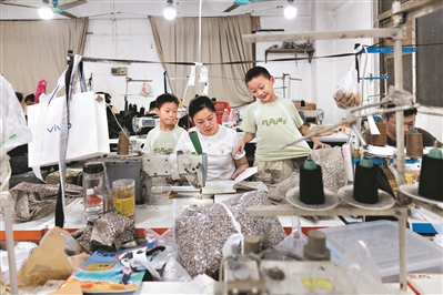 7月18日,鹭江村一家制衣厂内的流水线上,夏姓双胞胎正缠着妈妈检查自己的作业。这个暑假,这位妈妈给两个儿子布置了一些额外的暑假作业,她上班时两兄弟就趴在缝纫机上写作业。