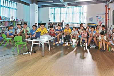 7月30日,在海珠区鹭江村27号四楼的凤阳图书馆,孩子们坐在一起看动画电影。