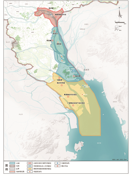 在空间结构方面,《规划》提出,打造“一带三区、串珠成链”的海岸带空间格局。“一带”是指沿珠江前后航道—狮子洋—伶仃洋的海洋经济创新发展带;“三区”是指北部古港活力都市风貌区、中部海岛生态人文风貌区、南部滨海智创新城风貌区;“串珠成链”即串联海岛、滨海特色产业集聚区等,为海洋经济发展提供战略空间。