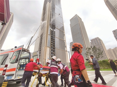 当天下午,广州市国际金融城内,一辆辆消防车呼啸而过,一架架无人机升空救援。演练模拟某超高层建筑18楼因电气线路故障引发火灾,火势在10分钟内蔓延至300平方米,高温烟气引发闪爆,造成多名人员被困。