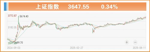 截至8月11日收盘,上证指数涨0.34%报3647.55点,深证成指涨1.46%,创业板指涨1.96%。昨日沪指盘中最高报3656.85点,距离去年阶段性高点已不足20个基数点。