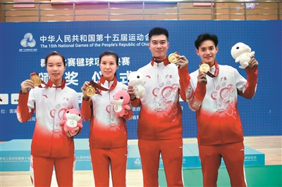 广州日报讯 (全媒体记者周婉琪)昨日,在广州应用科技学院(肇庆校区)体育馆举行的十五运会群众比赛毽球项目决赛决出首枚金牌,广东毽球队的陈畑怡、刘叶婷、黎文涛、谢维俊夺得花毽4×30秒混合团体接力计数赛的冠军,并以161次的成绩刷新了全国纪录,其中陈畑怡、黎文涛、谢维俊均为广州籍运动员。毽球于十四运会首次成为全运会比赛项目,花毽是十五运会毽球比赛新增小项,广东队因此也赢得了全运会历史上的首枚花毽金牌。