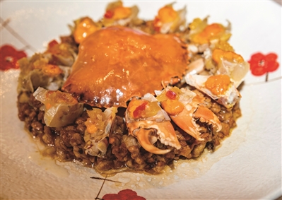 本地消费者还很爱兰花蟹,其又被称为花蟹、蓝花蟹等,因外壳有花纹而得名,体形大,整体呈蓝绿色并布有浅蓝或白色斑驳,母蟹膏肥,公蟹柔嫩。粤菜中有道经典的“姜葱炒兰花蟹”,将公蟹的胃、足、尖刺去除,用葱、小黄姜生炒,加入少许盐、蚝油和白糖,再加水、勾芡,炒制的蟹肉吸满汤汁,肉质滑嫩,油润不腻,鲜味盈满口腔,即便是家常菜,亦有多层风味。