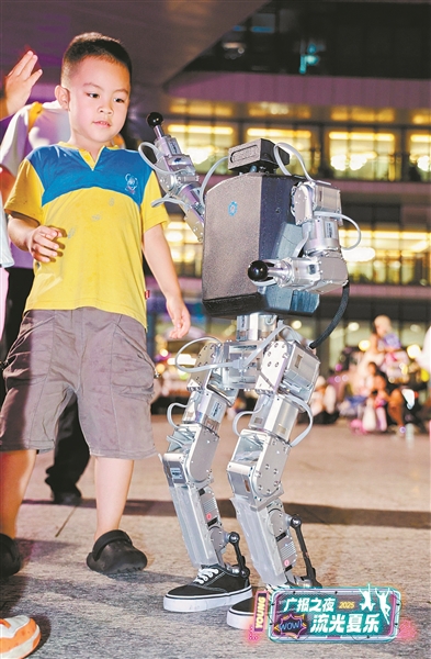 机器人互动区成了当晚最具人气的区域之一。“小海”成为全场“团宠”,孩子们不停地与其互动,大人们则好奇地询问技术细节。科技的温度与乐趣交融于此,与智能伙伴近距离接触,市民能亲身感受到广州作为创新之城的“智”造魅力,这样的夏夜给他们增添了不少乐趣。