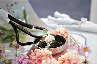 在高端医疗装备展品中,国内首款单孔手术机器人惊艳亮相,现场工作人员通过一个大型裸眼3D屏幕和两个操控手柄,正在指挥手术机器人的机械臂徒手剥鹌鹑蛋壳。