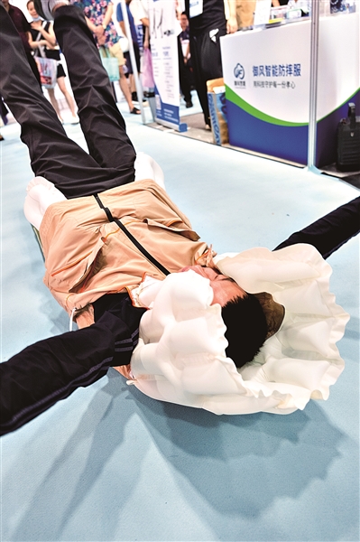 当人倒下时,智能防摔服会及时弹出气囊保护身体。广州日报全媒体记者庄小龙摄