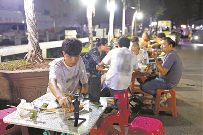 零点时分,刘伟独自在街边吃夜宵并拍摄视频素材。