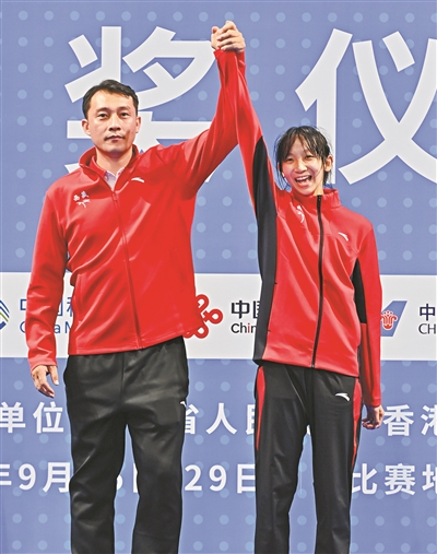 张楚玲(右)与教练在颁奖仪式上。新华社供图