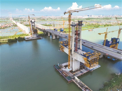 在中山小榄,深江铁路小榄水道特大桥首个主塔近日顺利封顶。施工单位中铁广州工程局项目负责人告诉记者,建设团队采用新研制的上承式造桥机,配备“智能集成控制系统、自动走行控制系统、智能监测系统”三大智能系统,确保主塔施工安全高效推进。