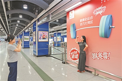 市民在全运会主题站的装饰画前拍照。
