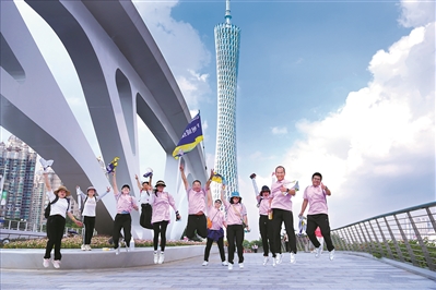 徒步队伍化作七彩的人流,在珠江畔缓缓流淌。来自市妇联、团市委、海珠区、广州城投集团、广州日报报业集团、广发信用卡等单位分别组成的徒步方阵,以及一个由数十名留学生组成的国际方阵,共近千人用脚步“丈量”广州最美江岸,传递羊城喜迎全运的热情。