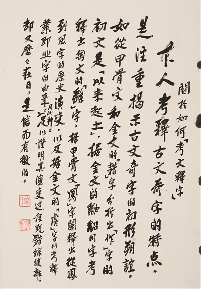 举其中一幅书笺的例子提到曾宪通集诸老之大成:考释古文字其实也有不同的流派,容、商两位先生注重实证,也就是字形。两位先生很少讨论材料以外的东西,商先生对一些主观臆测过多的论证方式一向不屑一顾。于省吾先生也重字形,他在《甲骨文字释林》的序中说:“字形为确切不移的客观存在。”早期的字形往往体现出这个字的造字理据,比如说甲骨文中的“作”字,当时大家都知道这个字就是甲骨文的“作”字,却没有人知道为什么“作”在甲骨文中写成这样。曾宪通对甲骨文中“作”的一系列字形进行了分析,进而得到了“以耒起土”这一结论,如果去看一下甲骨文的字形,就会发现这是非常直观的。古文字的字形很重要,但分析古文字却不能只限于字形,几位老先生重字形也不是只看字形。“作”这个用法真是贯通古今,所以联系词的音义和上下文意对考释古文字同样十分重要。除此之外还需要充分利用文字区域特点和出土实物,这在具体的考释中有时也可能是关键一环。方法重要,视角也很重要。