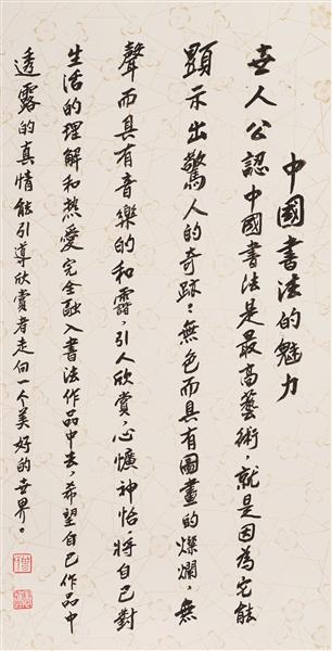 世人公认中国书法是最高的艺术,就是因为它能显示出惊人的奇迹:无色而具有图画的灿烂,无声而具有音乐的和谐。引人欣赏,心旷神怡。将自己对生活的理解和热爱完全融入书法作品中去,希望自己的作品中透露的真情能引导欣赏者走向一个美好的世界。——曾宪通