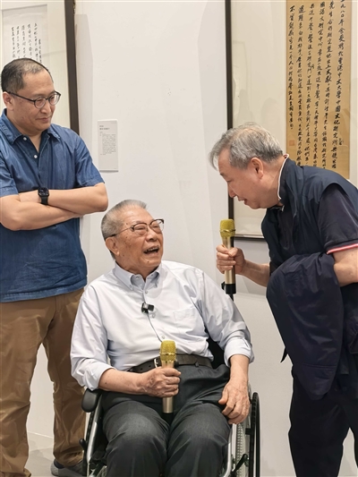 开幕式上,曾宪通(中)与友人许礼平(右)忆起往日趣事,策展人宋浩(左)陪伴在旁。