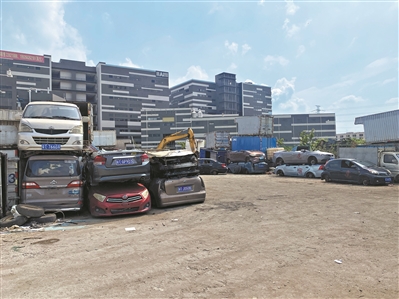 中山某报废站场内,堆放了不少等待处理的报废汽车。其中,少数新能源汽车将被统一转运至再生资源公司进行回收。