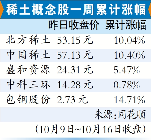 广州日报讯 (文/表 全媒体记者 谭伟婷)受政策调控及国际动态多重因素驱动,本周稀土板块表现亮眼。10月13日,A股低开高走,稀土概念股领涨,板块内19只个股涨停或涨幅超10%。截至10月16日收盘,北方稀土、中科三环、盛和资源股价虽有所回落,但得益于此前涨幅,前三季净利润增幅均达100%以上。