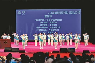 会上,十五运会广东赛区赛会志愿服务队、残特奥会广东赛区赛会志愿服务队获授旗;十五运会广东赛区城市志愿服务队、残特奥会广东赛区城市志愿服务队获授旗。350名赛会志愿者代表庄严宣誓:“我志愿服务十五运会和残特奥会,听从指挥、团结协作,微笑服务、不辱使命,践行志愿精神,弘扬先进文化,为湾区添彩,为祖国争光!为你,更精彩!”