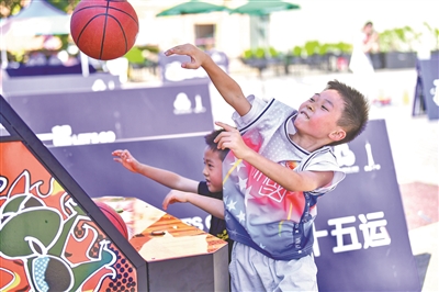 除了精彩表演,现场还有丰富的体育互动体验。迷你运动会人气持续攀升,旱地冰壶、两人三足、智力拔河等趣味项目陆续展开,吸引众多亲子家庭与年轻人组队参与。另一侧的互动游戏区同样热力十足。市民们骑上动感单车热力开“练”,挑战投篮一击即“中”,体验“足”够精彩的趣味足球……多个潮流运动游戏,让大家在运动中释放活力,感受全运氛围。