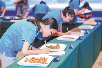 在中药材鉴定竞赛项目实操考核现场,记者看到十几张桌子的桌面上摆放了80种中药材,有动物类、有植物类,还有中药饮片以及中药粉末。参赛选手按照序号依次排开,同时进行鉴定。在每个中药材面前,选手可以停留53秒,通过观看、闻气味、摸质感以及品尝等方式进行鉴定并即刻书写答案。时间一到,选手们必须立刻按照现场指令统一移动到下一个中药材面前,如此重复80次。