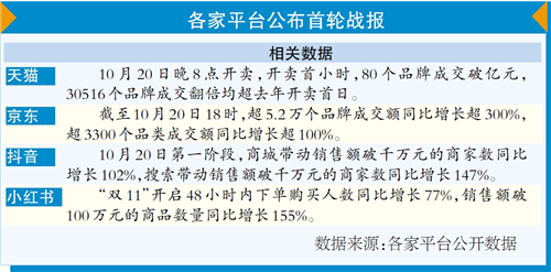 10月20日,抖音电商发布“双11”第一阶段数据,商城带动销售额破千万元的商家数同比增长102%。小红书披露,10月11日~12日“双11”开门红,明星章小蕙直播间开播6小时突破1亿元。