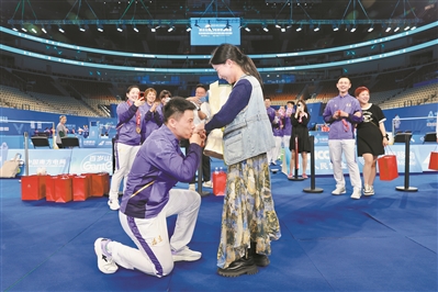 福建队夺得混合团体B组金牌,除了沉浸在夺金的喜悦外,还上演了全运会赛场求婚的甜蜜时刻。在颁奖仪式结束后,福建队B组团体赛男双选手陈扬现场单膝跪地,拿着一束鲜花向女朋友曾女士求婚。两人是因为平时打羽毛球而认识,这次曾女士到深圳一直陪伴男友。当被求婚的一幕上演时,曾女士表示非常激动,因为自己事前并没有想到。