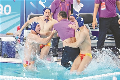 谈及被队员拉下水的感受时,陈卫汉说:“我也好久没有下水了,跟队员一起体验那种激情,非常兴奋,第六次赢得全运会冠军,不负我们对水球的热爱。”