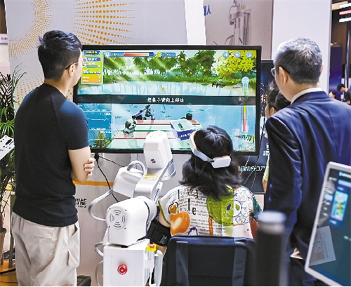 记者在该公司的展台上见到了一款脑机接口头环,据工作人员介绍,这款头环名为“前额叶脑功能成像系统”,它可以实时采集大脑活动,安全精准地解码运动意图,准确识别人体运动方面的脑电信号,“对于因外伤等各类原因导致的神经受损,脑机接口可绕开人体受损的神经,直接读懂脑信号。这些脑信号再通过康复机器人的辅助,就可以实现患者上下肢以及全身多关节的锻炼和康复。”此外,公司还设计生产了“上肢评估与训练系统”“下肢评估与训练系统”等多个脑机接口+康复机器人集成产品。