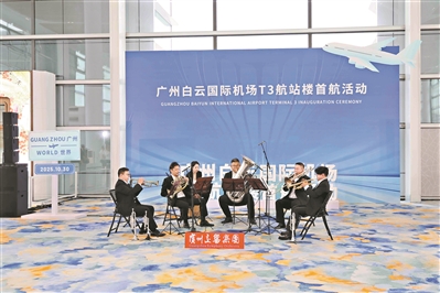 在广州交响乐团“灿烂金属”铜管五重奏激昂雄壮的乐声中,广州白云国际机场T3航站楼正式向世人揭开神秘面纱。在现场洋溢的喜庆与艺术氛围中,首批旅客在接受机场赠送的纪念品后登机。