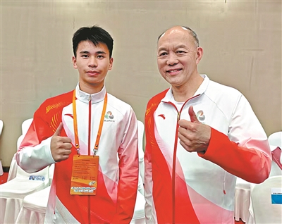 广州站火炬手年龄最小的钟炜锋(左,16岁的国家跳绳队队员)和年龄最大的霍震寰(76岁的霍英东集团行政总裁)