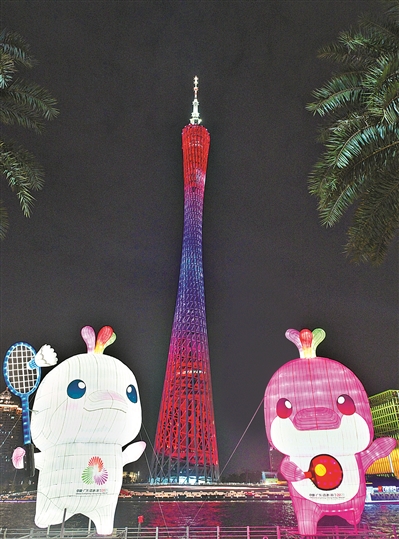 两只吉祥物与广州塔彼此呼应,交相辉映。
