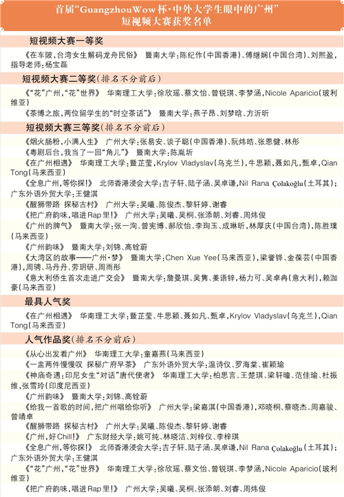 在颁奖仪式现场,大赛共揭晓了“十大人气作品”10件、“最具人气奖”1件、三等奖10件、二等奖2件及一等奖1件。其中,“最具人气奖”作品《在广州相遇》来自华南理工大学,获得定制金色奖牌及3000元奖金;而来自暨南大学的作品《在车陂,台湾女生解码龙舟民俗》斩获一等奖,团队赢得奖牌及1万元创作基金。