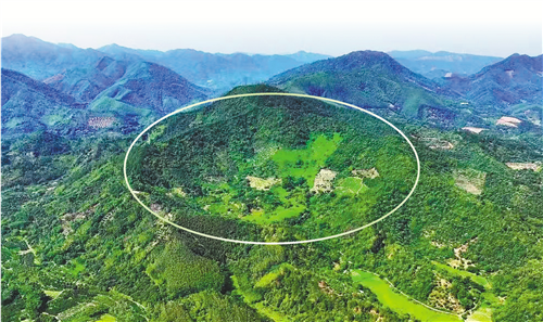 那到底这个神秘的陨石坑长什么样呢?记者昨日一早到金林村探个究竟。记者在金林村附近通过无人机航拍,找到了这个新发现的金林陨石坑,它就处在一座高山的山坡上,保存状态良好,呈现为一个直径近千米的巨大碗形凹坑。