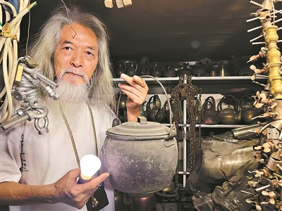 苏广伟向记者展示有百年历史的铜制提梁饭煲。