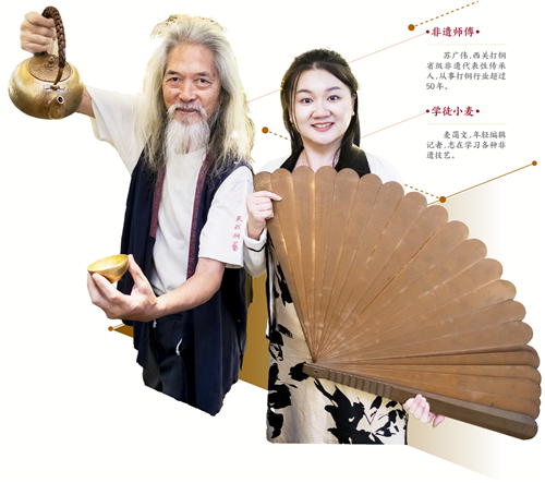 “西关打铜和日常生活息息相关,先给大家介绍下这些铜杯、铜筷子……”刚学习打铜基本功,小麦马上就受邀“上岗”担任非遗主播,对着手机向网友推介新研发的铜制品。原来,为了让西关打铜技艺走出老西关,苏广伟的儿子苏英敏试水开直播,圈粉了一批非遗爱好者,还为铜制品销售打开了一条新路径。