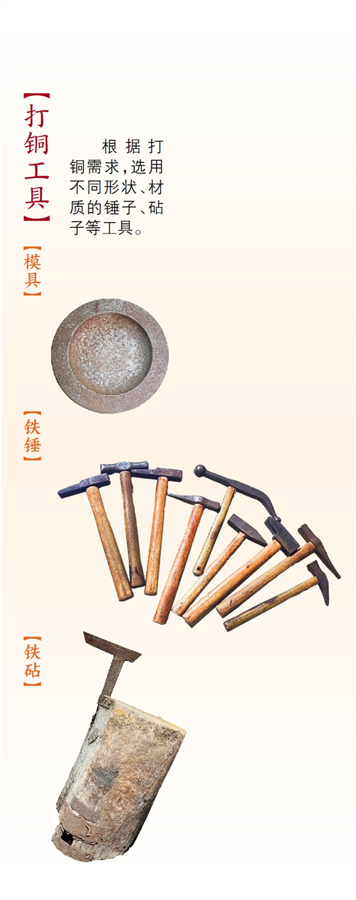 接下来,小麦要把这块圆形铜片打成杯垫。“这些工具在锻打时发挥着不同的作用,有的甚至在市面上都买不到,是我们亲自设计制作的。”苏师傅一字排开各式各样的工具,尖头锤、圆头锤、锉子、砂纸、铁砧、木砧……