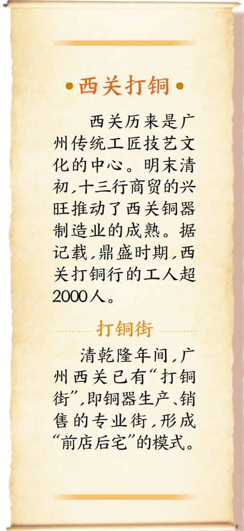 “一开始,西关人并不熟悉打铜技术,请来江浙的师傅传授打铜技巧。随着西关工匠技艺精进,业界有了‘苏州样,广州匠’一说。”据苏广伟师傅介绍,清乾隆年间,广州西关已有“打铜街”,即如今光复南路一带,集聚大批铜器铺,出现“前店后宅”模式。鼎盛时,打铜行业工人一度超过2000人。