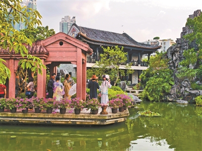 广州以“绣花功夫”推动历史文化街区更新,图为年轻人身穿汉服在广州粤剧艺术博物馆内拍摄打卡。广州日报全媒体记者骆昌威摄