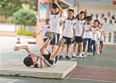 广州花都区七星小学的孩子们在欢笑中进行跳绳训练。
