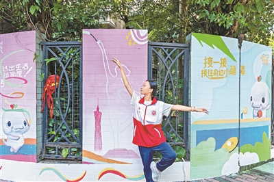 青少年在充满全运会元素的彩绘墙前跳个舞。