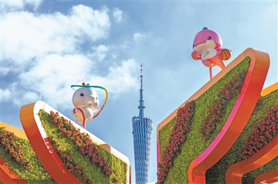 艺术体操“喜洋洋”和篮球“乐融融”与广州塔同框。 广州日报全媒体记者苏俊杰摄