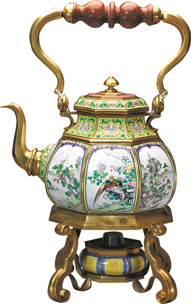 乾隆款画珐琅八棱开光山水花鸟图提梁壶