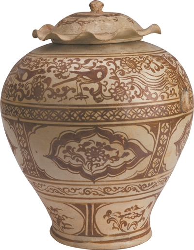 元雷州窑釉下褐彩凤鸟纹荷叶盖罐